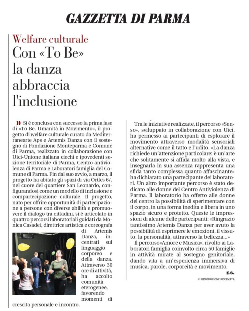 progetto di welfare culturale curato da Mediterranearte APS e Artemis Danza, con il sostegno di Fondazione Monteparma e Comune di Parma, realizzato in collaborazione con UICI – Unione Italiana Ciechi e Ipovedenti Sezione territoriale di Parma, Centro Antiviolenza di Parma e Laboratori Famiglia del Comune di Parma